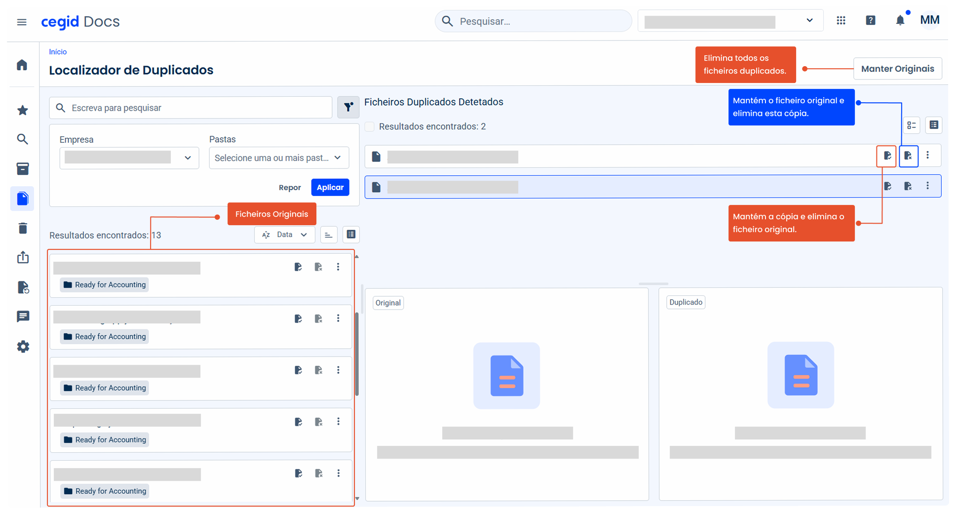 Nota: poderá selecionar vários documentos duplicados de uma só vez. Para isso, deverá clicar na opção Multiseleção, selecionar os ficheiros duplicados pretendidos e escolher a operação pretendida na barra de operações dos ficheiros duplicados.