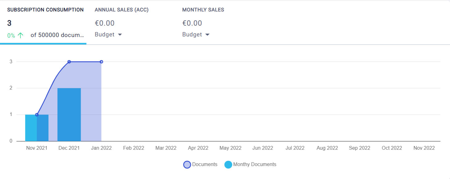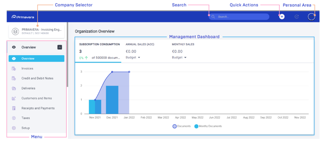 - Overview: By clicking the Overview, all the available features are presented. From documents to setups, you can manage all company data, so that you can invoice;