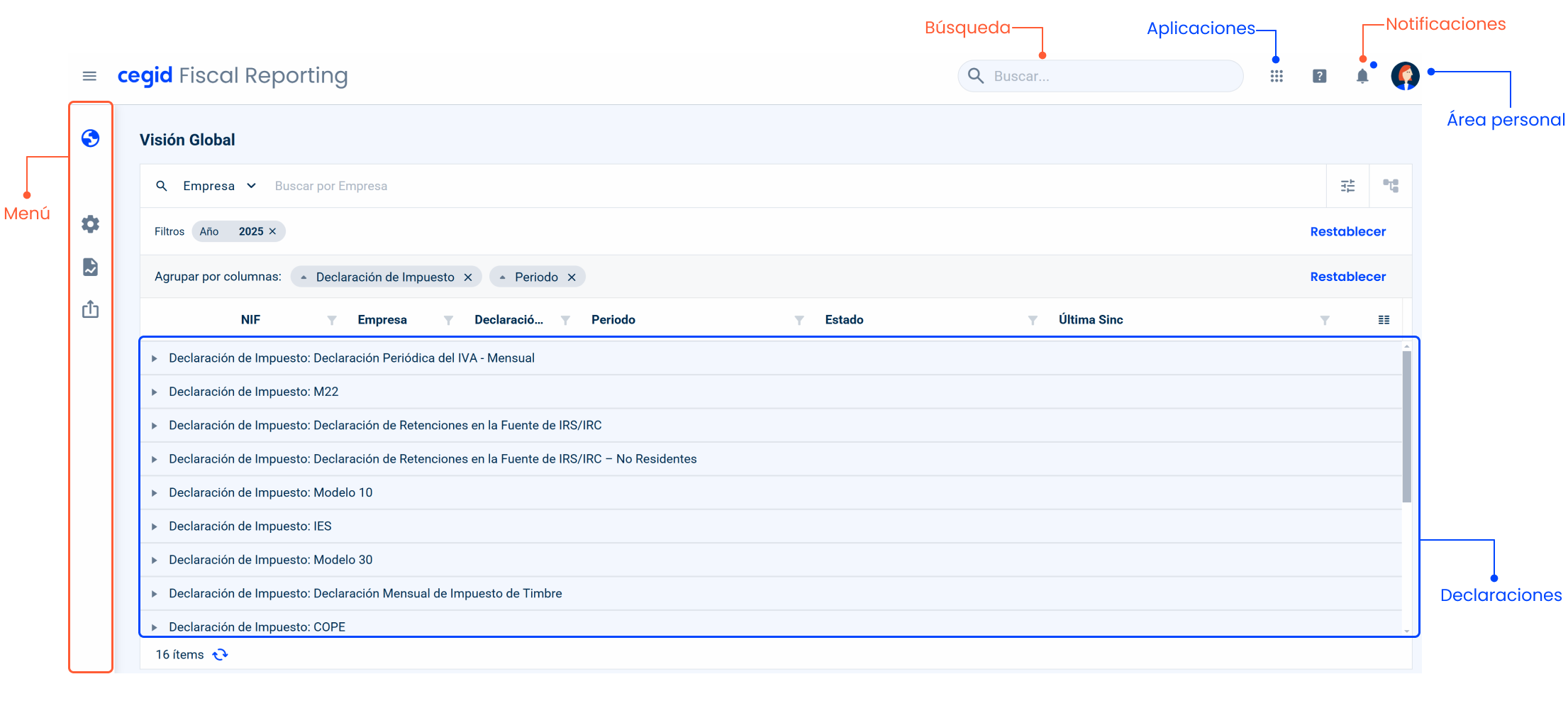 Cegid Reporting Fiscal es una aplicación diseñada para facilitar la gestión y presentación de las obligaciones legales y fiscales a las que están obligadas las empresas. Es decir, permite gestionar los distintos modelos/declaraciones en función del mercado en el que se encuentren las empresas y la respectiva periodicidad de entrega, proporcionando una interfaz sencilla e intuitiva: Para garantizar un seguimiento constante de los informes fiscales, se dispone de perfiles de usuario para gestionar internamente la creación, presentación y consulta de obligaciones. Fiscal Reporting engloba los procesos y operaciones relacionados con la entrega de informes fiscales de forma totalmente integrada con el software de contabilidad. Para empezar a trabajar en Fiscal Reporting, sólo necesitas seguir los siguientes pasos, en función de tu perfil de acceso: Con este perfil, debes: Con este perfil, debes:Cómo Empezar