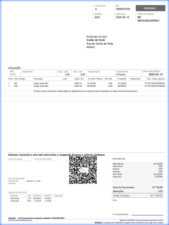 A faturação eletrónica em Angola insere-se na reforma tributária em curso, que visa reforçar a transparência fiscal, combater a economia informal e modernizar a relação entre contribuintes e Administração Geral Tributária (AGT). O novo Regime Jurídico das Faturas, aprovado através do Decreto Presidencial n.º 71/25, de 20 de março, torna progressivamente obrigatória a emissão de faturas, preferencialmente em formato eletrónico, através de programas de faturação certificados pela AGT, com requisitos específicos de conteúdo, integridade e comunicação dos dados. Este regime aplica-se sobretudo aos sujeitos passivos de IVA, iniciando-se com grandes contribuintes e fornecedores do Estado, e prevendo-se uma implementação faseada ao restante tecido empresarial. As empresas devem adaptar os seus sistemas e processos internos, garantindo o uso de software certificado, a transmissão eletrónica das faturas à AGT e o arquivo seguro da documentação, sob pena de sanções e potenciais constrangimentos na sua relação fiscal e comercial. Para obter explicações detalhadas e exemplos práticos, recomenda-se a consulta da página dedicada sobre Faturação Eletrónica da Cegid. Para dar resposta a este requisito legal, o ERP v22 segue o seguinte fluxo operacional: Os documentos emitidos até à data de início da comunicação continuam a ser reportados através do ficheiro SAF-T. Não pode ser realizada a comunicação destes documentos eletronicamente, já que não podem ser associados a uma série validada pela AGT. A partir da data definida para o início da comunicação, os novos documentos passam a ser comunicados via serviço de Faturação Eletrónica. Esta funcionalidade está disponível apenas para empresas com país-sede Angola e requer CASE ativo. Para garantir que o processo ocorra com sucesso, é necessário efetuar os seguintes procedimentos: Apenas os utilizadores Administradores conseguem efetuar todo o processo de ativação da Fatura Electrónica, nomeadamente criar um utilizador administrador nos Serviços Cloud Cegid. O registo nos serviços Cloud Cegid só precisa de ser efetuado uma vez para cada sistema, mesmo que existam diversas empresas no mesmo sistema. Ao ativar a Fatura Eletrónica nas restantes empresas do mesmo sistema, não serão solicitados os dados do utilizador. A operação de registo nos Serviços Cloud Cegid e a abertura da empresa armazenam informações na IsolatedStorage do WebServer onde está alojado o site do ERP e em alguns casos também na IsolatedStorage do utilizador em cada um dos postos. Por isso, caso estejam ativados mecanismos de limpeza do sistema operativo, deverá garantir que as informações nestas áreas do sistema operativo são preservadas. Caso existam vários sistemas a partilhar a mesma licença do ERP (a mesma Chave de Ativação), ao ativar este regime num desses sistemas adicionais (Sistema B) são invalidadas as credenciais geradas no sistema anteriormente ativado (Sistema A), impedindo neste (Sistema A) as comunicações com sucesso com a AGT. Para ultrapassar, todas as empresas devem ser mapeadas no mesmo sistema. Caso sejam usados vários sistemas, cada um deles tem de ter uma licença própria para o ERP. Se existirem vários sistemas em várias localizações com licenças do ERP diferentes e que foram emitidas para o mesmo NIF da empresa, é necessário garantir que o nome da BD de sistemas tem nomes diferenciados em cada uma das localizações. Caso existam duas localizações diferentes que partilhem a mesma combinação < NomeSistema > + < NomeEmpresa >, ao ativar a fatura eletrónica numa localização irá invalidar a ativação efetuada para as localizações anteriores. Uma vez que a obrigatoriedade da Faturação Eletrónica não se aplica, nesta fase inicial, a todos os contribuintes, é necessário proceder à ativação explícita da adesão no sistema. Para ativar a faturação eletrónica, siga os seguintes passos: Caso sejam utilizadas Faturas de Adiantamento ou Reportes Personalizados, recomendamos a consulta das secções Tipos de Documentos de Adiantamento e Emissão de Documentos, respetivamente. Apenas os utilizadores administradores têm acesso à janela da configuração, uma vez que é necessário indicar um utilizador administrador a utilizar nos Serviços Cloud Cegid para ser possível carregar os certificados de cada uma das empresas. Na edição de grupos/utilizadores estão disponíveis duas permissões que permitem a comunicação das séries e a consulta de estados: Em Configuração | Configuração, deverá ativar/configurar as seguintes opções: Poderá atualizar estes dados quando for necessário. A partir desta janela, poderá clicar no botão Enviar Certificados para adicionar os certificados da empresa. No âmbito da faturação eletrónica, a Administração Geral Tributária (AGT) definiu um tipo fiscal de documento específico para as faturas de adiantamento. Desta forma, as faturas de adiantamento devem ser emitidas utilizando o tipo fiscal FA – Fatura de Adiantamento, sendo para tal necessário adicionar novos tipos de documentos. A utilização de documentos configurados com este tipo fiscal apenas deve ocorrer após ativação da faturação eletrónica, dado que no processo de comunicação de documentos através do ficheiro SAF-T não existe a tipologia FA, sendo obrigatório, nesse contexto, continuar a comunicar os documentos de adiantamento com o tipo fiscal FR – Fatura-Recibo. Esta distinção é essencial para garantir a correta comunicação dos documentos à AGT e o cumprimento das obrigações fiscais, evitando rejeições ou inconsistências na validação dos documentos. No ERP as regras aplicam-se aos tipos de documentos definidos na janela Editar Tipos de Documentos de Liquidação, sempre que esteja selecionado o tipo de liquidação Adiantamento. 1. Faturação Eletrónica (AO) ativa Quando o serviço de Faturação Eletrónica est