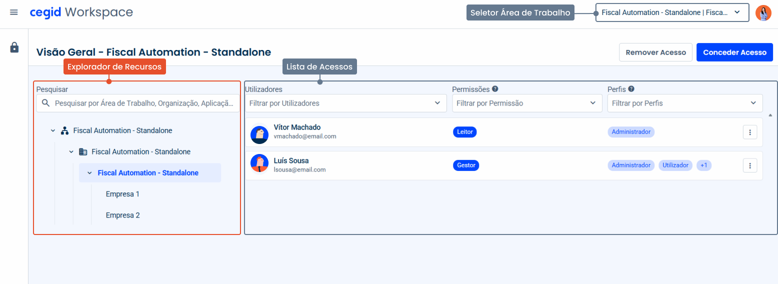 O Cegid Workspace é uma aplicação com o objetivo de centralizar a gestão de acessos às aplicações que possui na sua área de trabalho. É possível juntar no mesmo workspace organizações diferentes das quais faz parte e onde cada uma terá as suas aplicações. Para conseguir gerir os acessos às várias aplicações é necessário ter o perfil Gestor. O Fiscal Automation não impõe qualquer limite ao número de utilizadores que podem aceder à plataforma. Se clicar no seletor, este expande-se e apresenta os diversos workspaces (áreas de trabalho) nas quais tem autorização para gerir acessos, sendo possível alternar entre estas. O seletor apresenta ainda uma caixa de pesquisa para localizar rapidamente a área de trabalho, bem como a possibilidade de destacar áreas de trabalho colocando estas no topo da lista. O Explorador de Recursos proporciona uma navegação hierárquica eficiente para explorar o workspace (organizações, aplicações e empresas). Esta funcionalidade está estruturada em forma de árvore para que possa navegar até ao nível pretendido para gerir acessos. É importante destacar que pode alterar os nomes do workspace, organização e aplicações para atribuir nomes mais identificativos da sua realidade. Poderá também pesquisar pelo nome do recurso. Esta pesquisa abrangente e flexível torna a utilização do explorador mais prática e eficaz na hierarquia dos recursos. Esta área apresenta informações detalhadas sobre os utilizadores com acesso ao recurso selecionado no Explorador, ou seja, se selecionar a aplicação Fiscal Automation serão apresentados todos os utilizadores com acesso às empresas existentes nesta aplicação. Caso selecione apenas uma determinada empresa, só são apresentados os utilizadores com acesso a essa empresa. Através desta lista, pode consultar de forma clara e organizada os utilizadores com acesso, incluindo informações relevantes como o nome e perfil. Com os filtros disponíveis, poderá consultar os acessos com base em diferentes critérios, por exemplo: Para facilitar a gestão dos acessos, poderá editar ou remover permissões diretamente na lista. Cada utilizador tem um determinado acesso no Cegid Workspace, que é totalmente independente dos perfis das aplicações: No caso específico das empresas, poderá também atribuir os perfis (funções) que os utilizadores podem adotar no Fiscal AutomationSeletor de Empresas